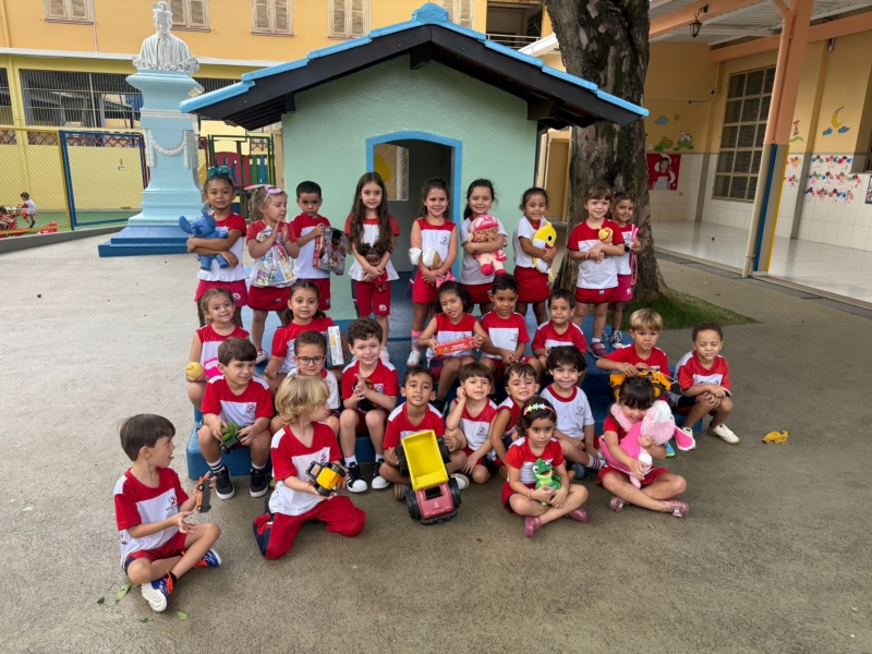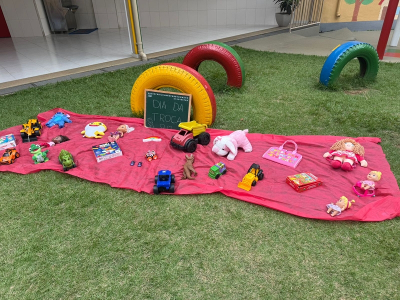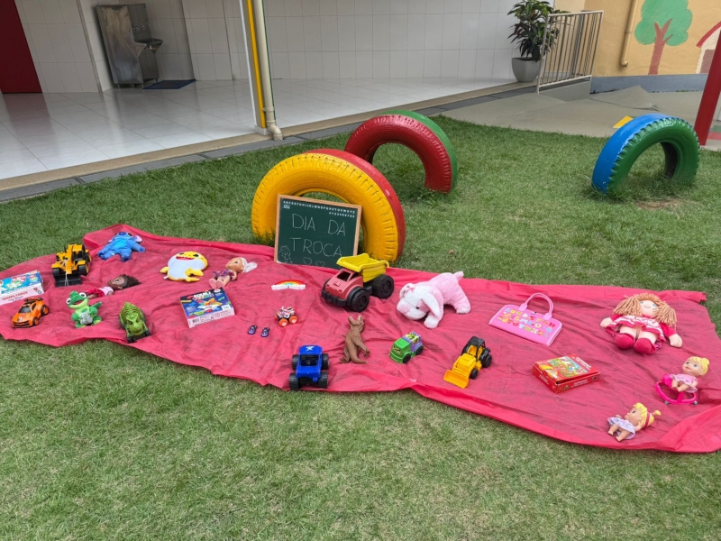 Cada criança trouxe um brinquedo para trocar com os colegas, vivenciando, na prática, valores importantes como compartilhar, desapegar e respeitar o que é do outro.